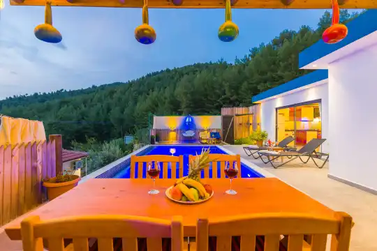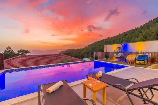Kalkan İslamlarda eşsiz doğa manzarasına sahiptir. 1 yatak odalı 2 kişi konaklama kapasitelidir. İç ve bahçe tasarımıyla oldukça konforludur. Korunaklı havuz terası ile muhafazakar balayı çiftleri için oldukça idealdir. Yatak odasında jakuzi yer almaktadır. Balayı çiftleri için muhafazakar jakuzili kiralık balayı villasıdır.