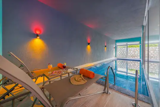 Kapalı ısıtmalı özel havuz, şezlonglar, barbekü alanı ve langırt masası mevcuttur.