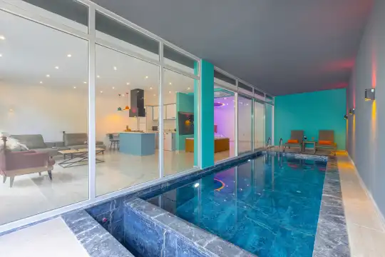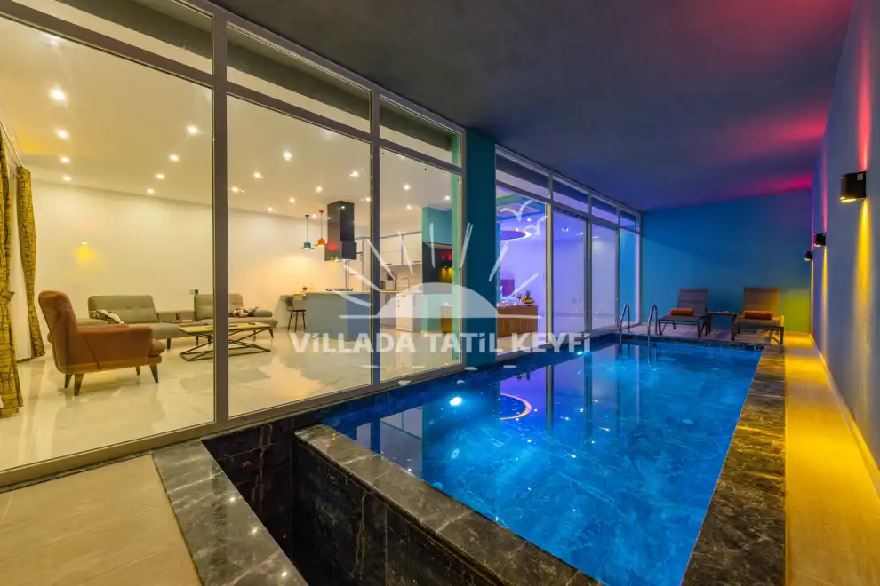 Villanın kapalı havuzu, hava koşullarından bağımsız olarak dört mevsim kullanılabilir. Korunaklı yapısıyla dışarıdan görünmeyen havuz terası sayesinde mahremiyet arayan çiftlere tam bir gizlilik sağlar.