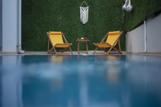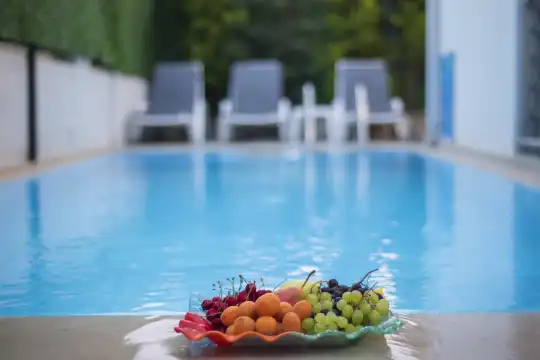 Özel Yüzme Havuzu: Şezlonglar ve geniş güneşlenme terası ile birlikte.