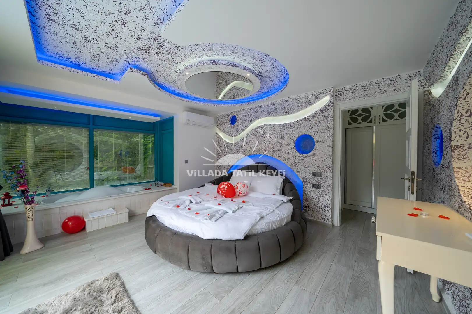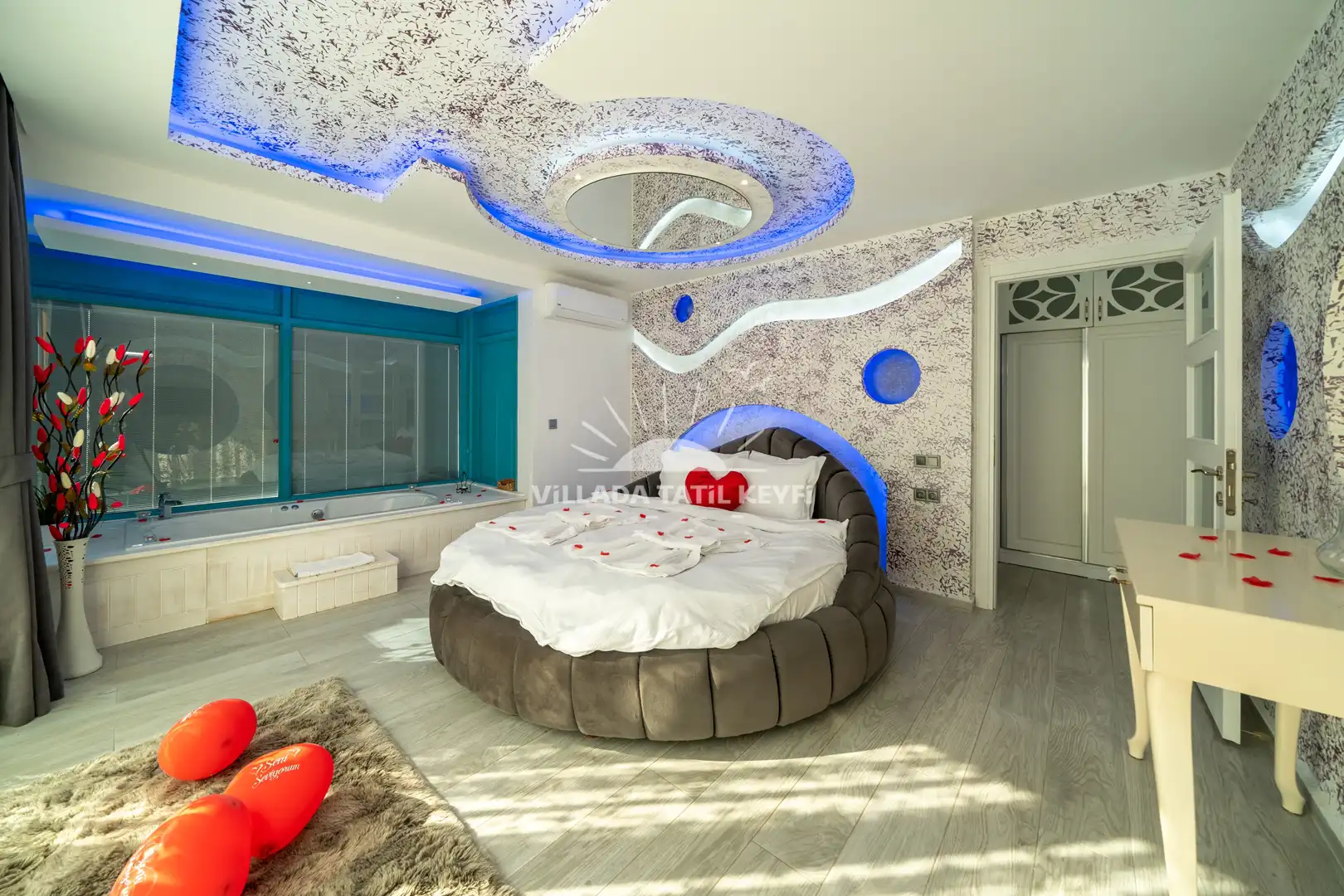 🛏️ 1 Yatak Odası: 1 çift kişilik yatak, elbise dolabı, komodin, makyaj masası, klima, özel jakuzi, banyo