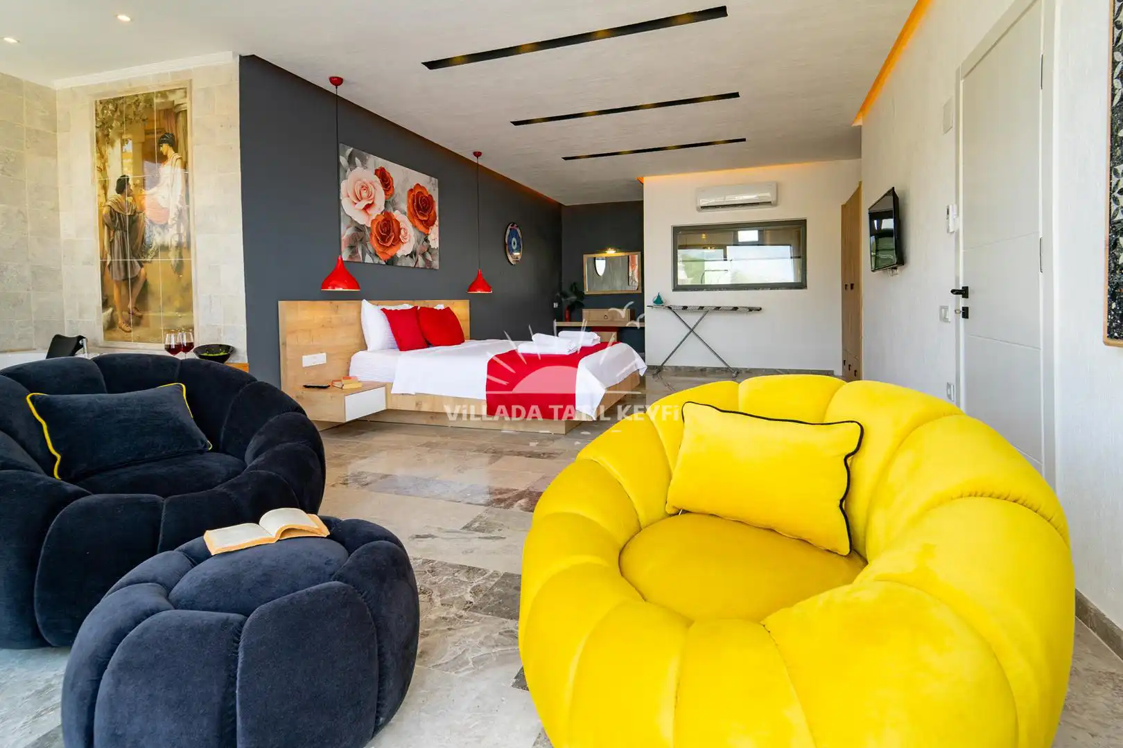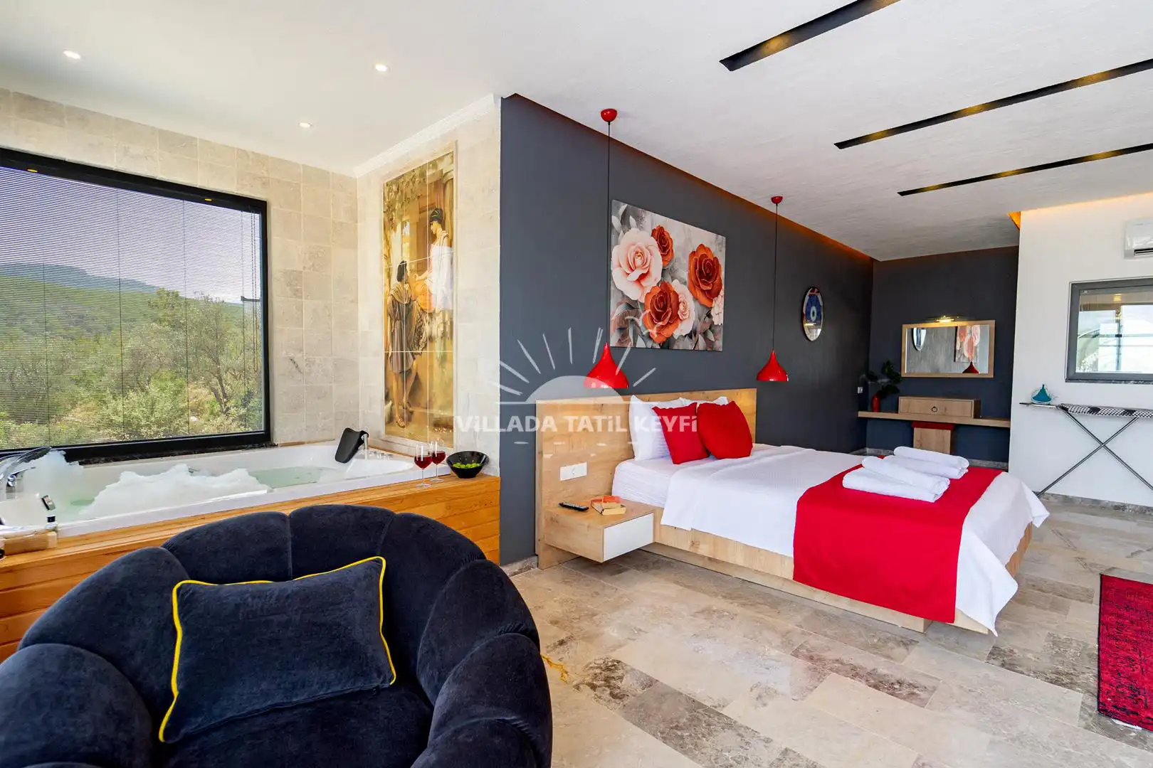1. Yatak Odası: Çift kişilik yatak, komodin, elbise dolabı, makyaj masası, klima, ebeveyn banyo, TV, jakuzi.