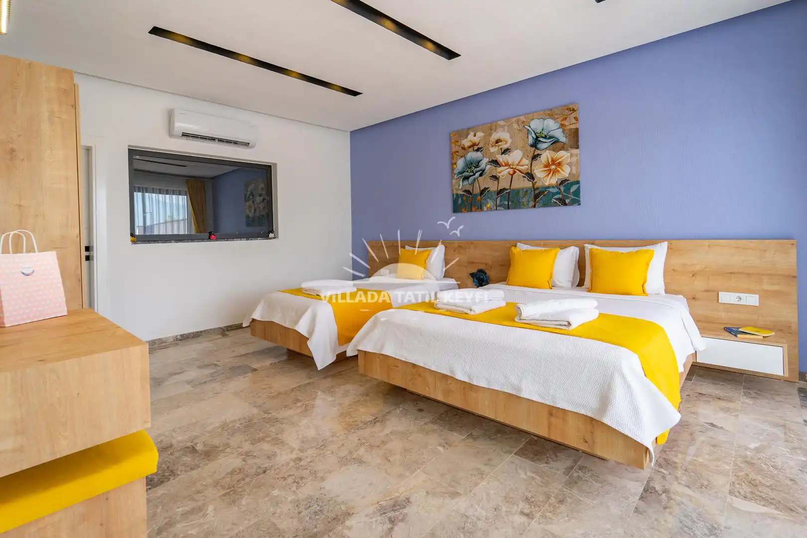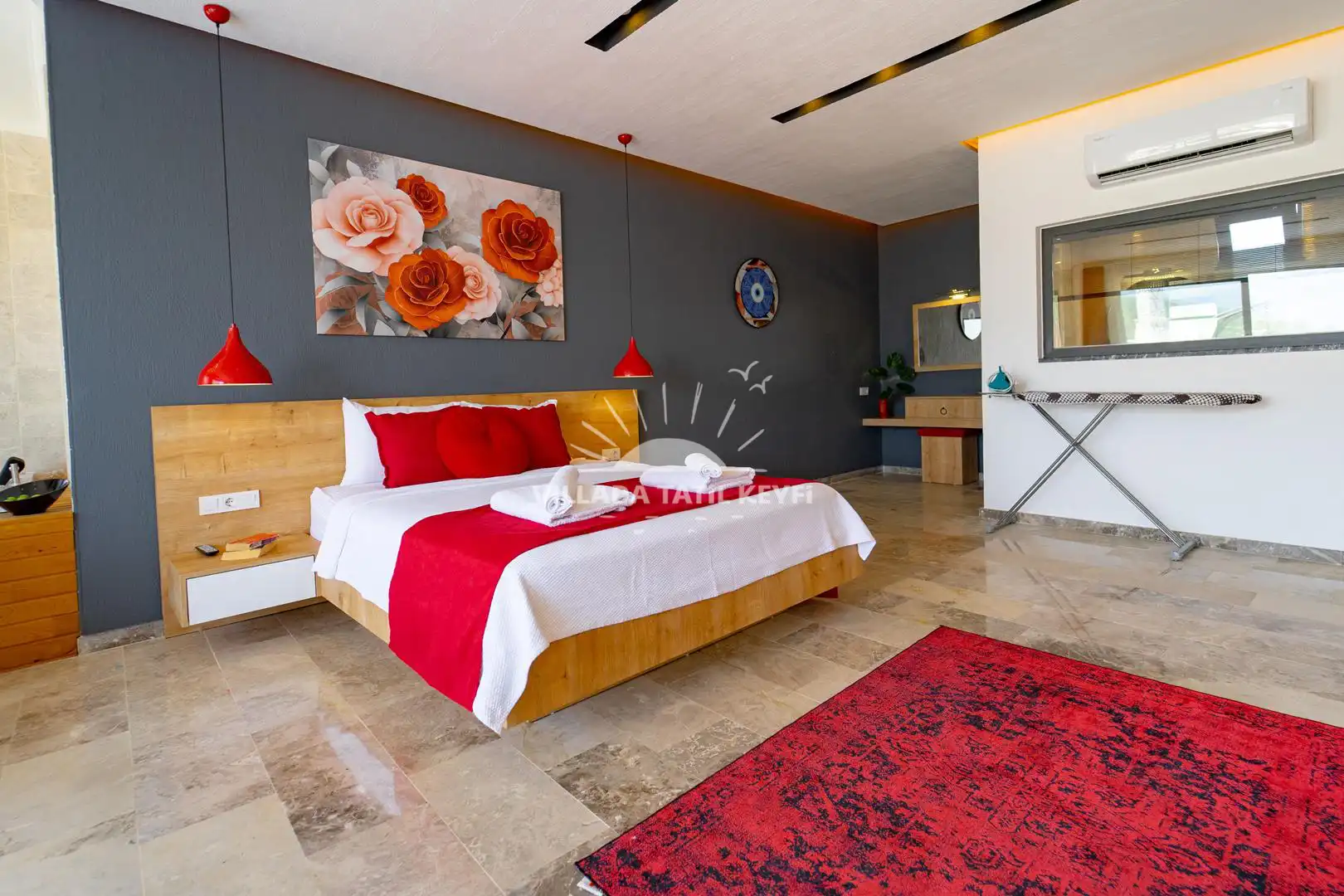 3. Yatak Odası: Çift kişilik yatak, tek kişilik yatak, komodin, elbise dolabı, makyaj masası, klima, ebeveyn banyo.