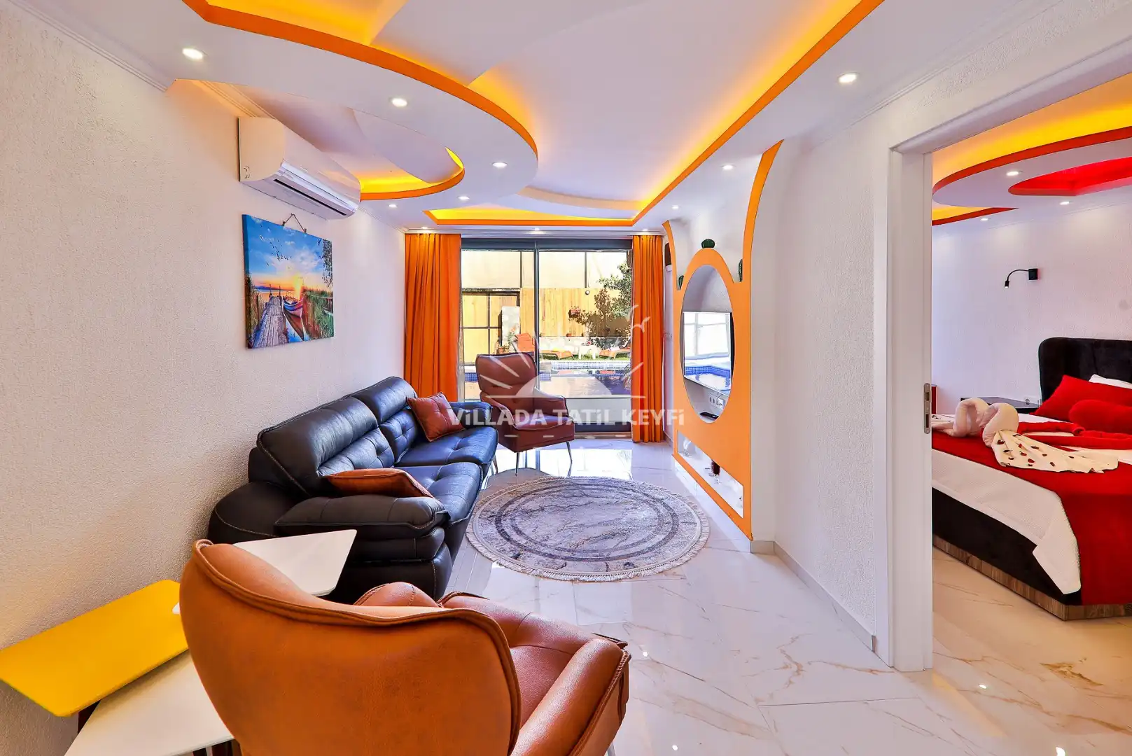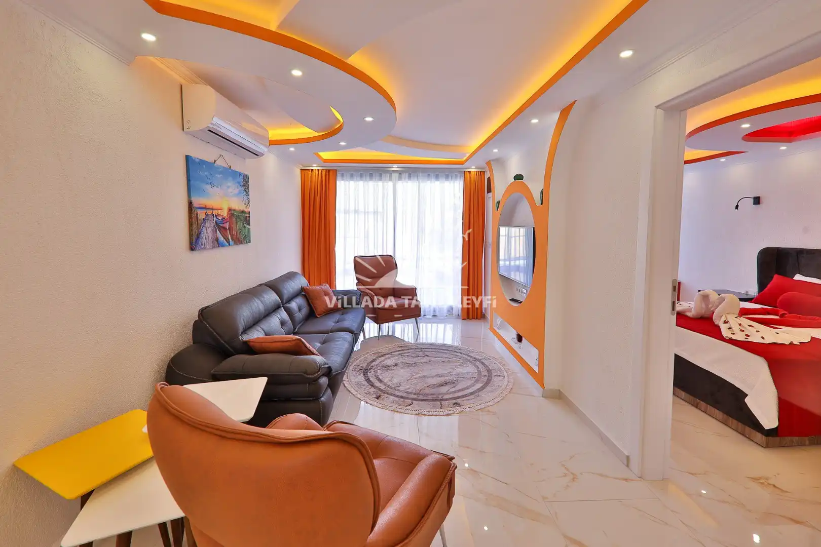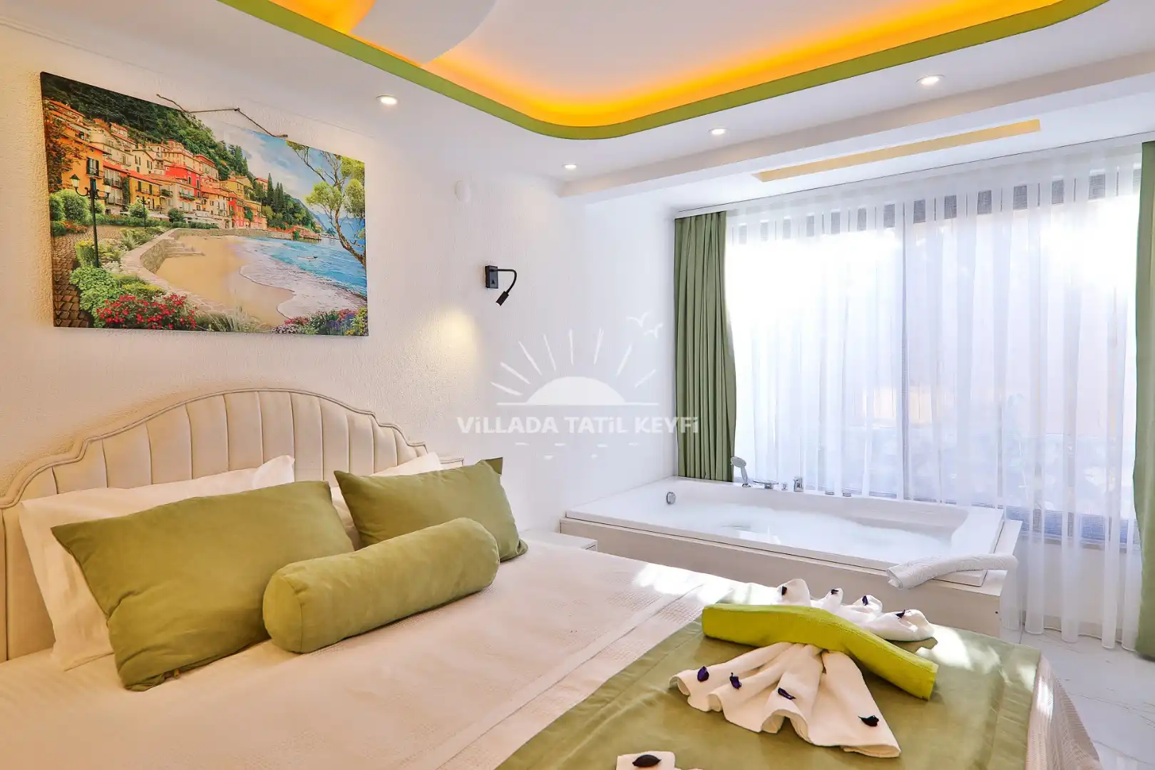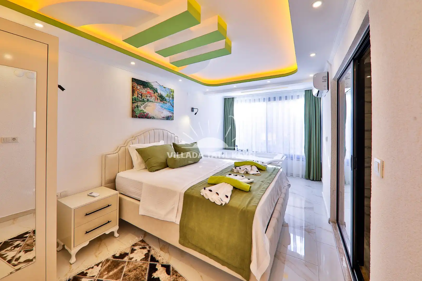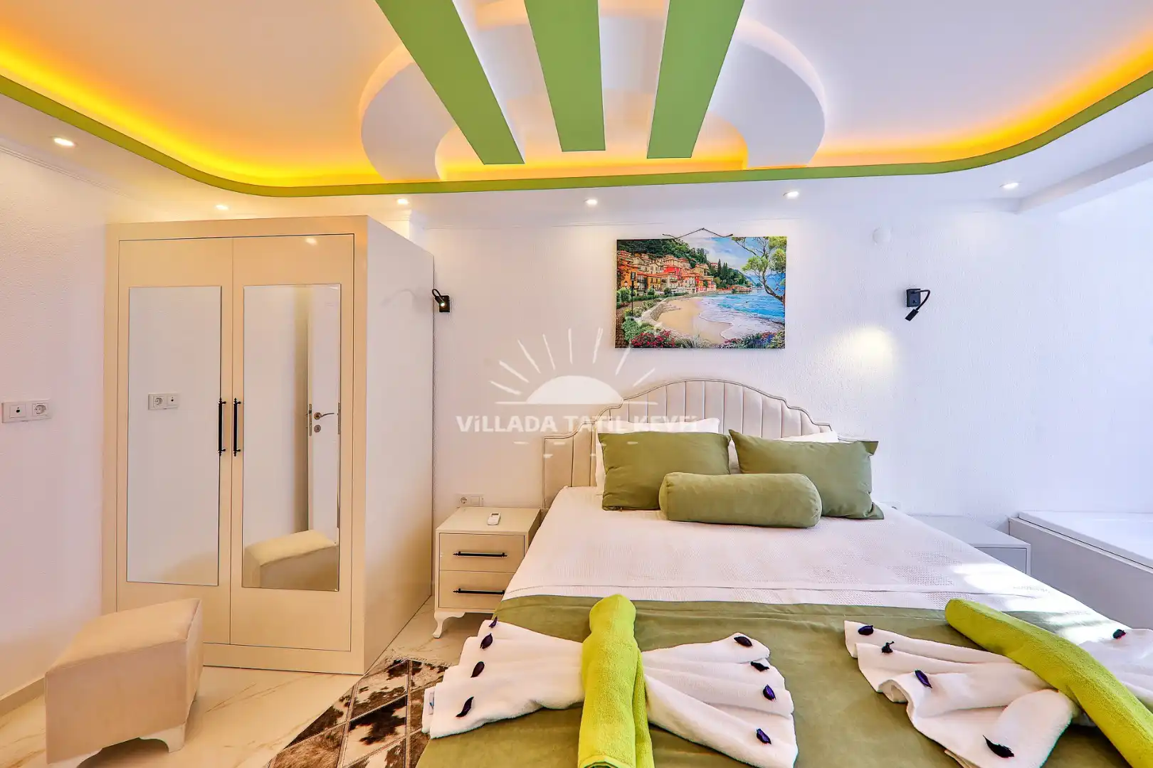 2. Yatak Odası: 1 çift kişilik yatak, komodin, elbise dolabı, makyaj masası, klima, ebeveyn banyosu, jakuzi.