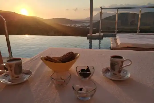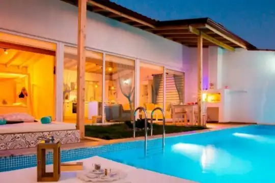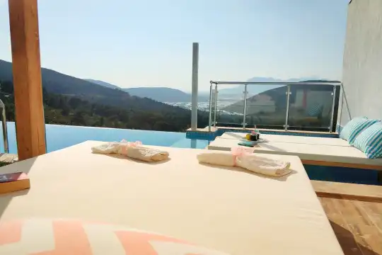 Kalkan'ın Akbel mevkiinde konumlu, 2 kişi konaklama kapasitesine sahip tek yatak odalı balayı çiftlerimiz için dizayn edilmiş kiralık tatil villamızdır. Özel havuz terası korunaklı olan villamızda muhafazakar çiftler gönül rahatlığıyla konaklama yapabilirler. Yatak odasında bulunan jakuzide senenin tüm yorgunluğunu üzerinizden atabilirsiniz. Muhteşem gün batımı manzarası eşliğinde akşam yemeklerinizi keyifle yiyebileceğiniz villamızda unutulmaz bir balayı tatili geçirebilirsiniz.