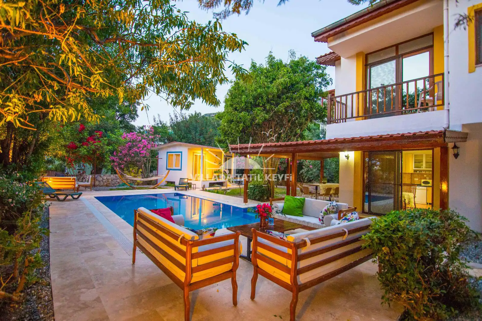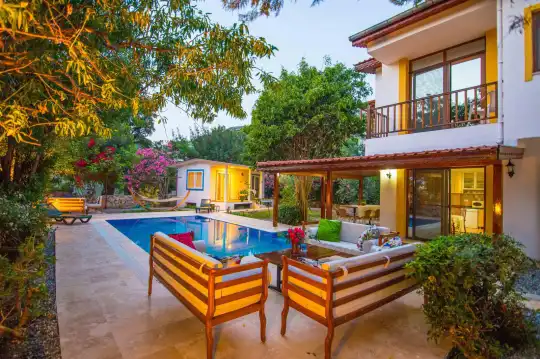 Marmaris cennet koyu Söğüt mevkiinde konumlu denize sadece 100 metre mesafede bulunan 4 yatak odalı ve 2 banyolu kiralık villamızdır. 8 kişilik konaklayabileceği villamızın toplam 4 yatak odasının 2 adet bir binasında 1 adet çift kişilik ve 2 adet tek kişilik yataktan oluşmakta olup diğer 2 yatak odası ise misafirhane kısmı olan bahçe içerisinde ki diğer binada 1 çift kişilik ve 2 adet tek kişilik yatak şeklinde bulunmaktadır. Ayrıca villamızın salonunun bölünmesinde ki yataklı koltuklarda da 2 kişi konaklayabilmektedir. Özel havuza sahip villamızın üst balkonlarından ve havuz ortamında muhteşem panoramik deniz manzarası görülebilmektedir. Villamızın son derece geniş ve yemyeşil bahçesi mevcut olup, kalabalık aile ve grup grupları için uygun villa seçeneklerimiz arasında yer almaktadır.