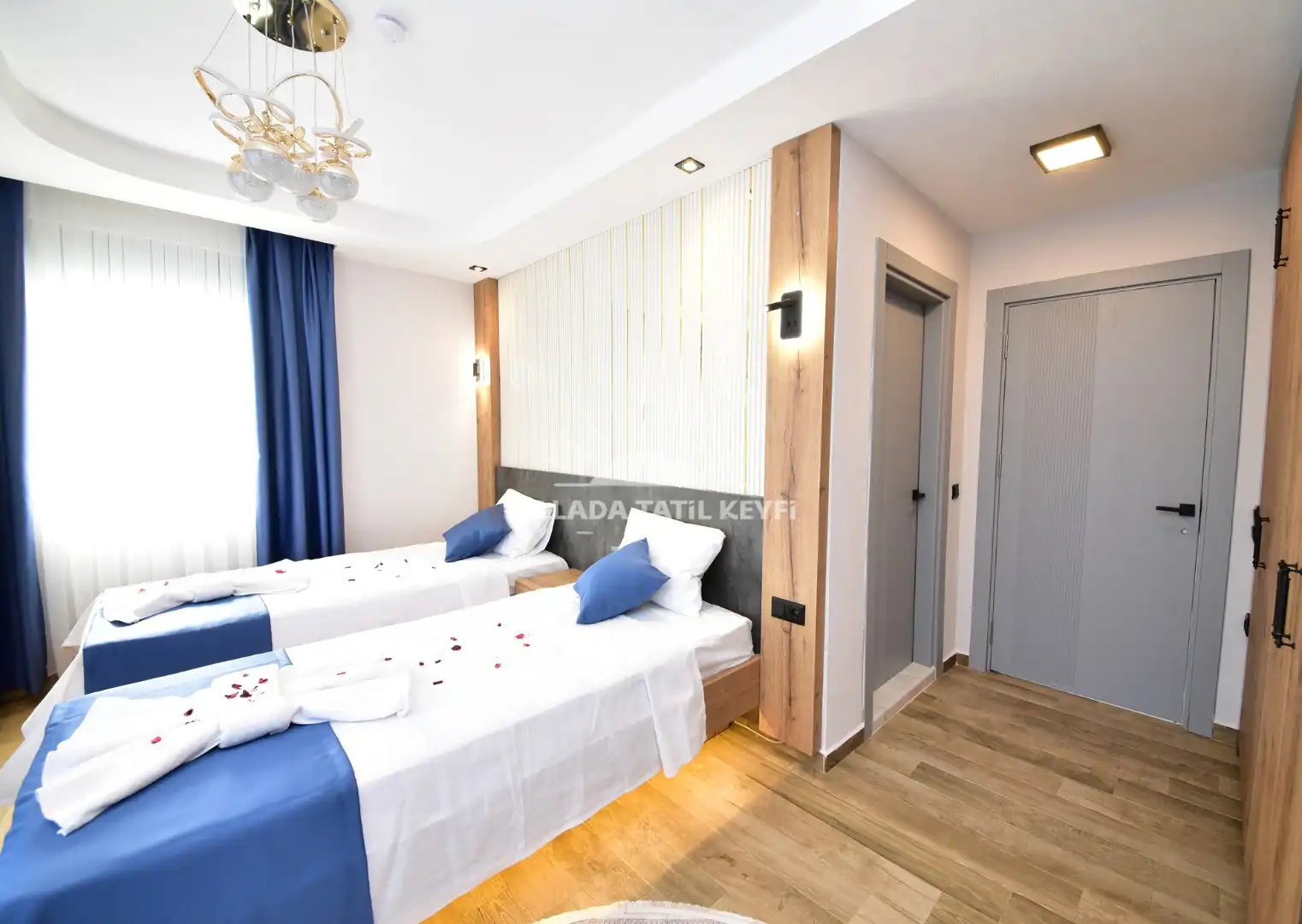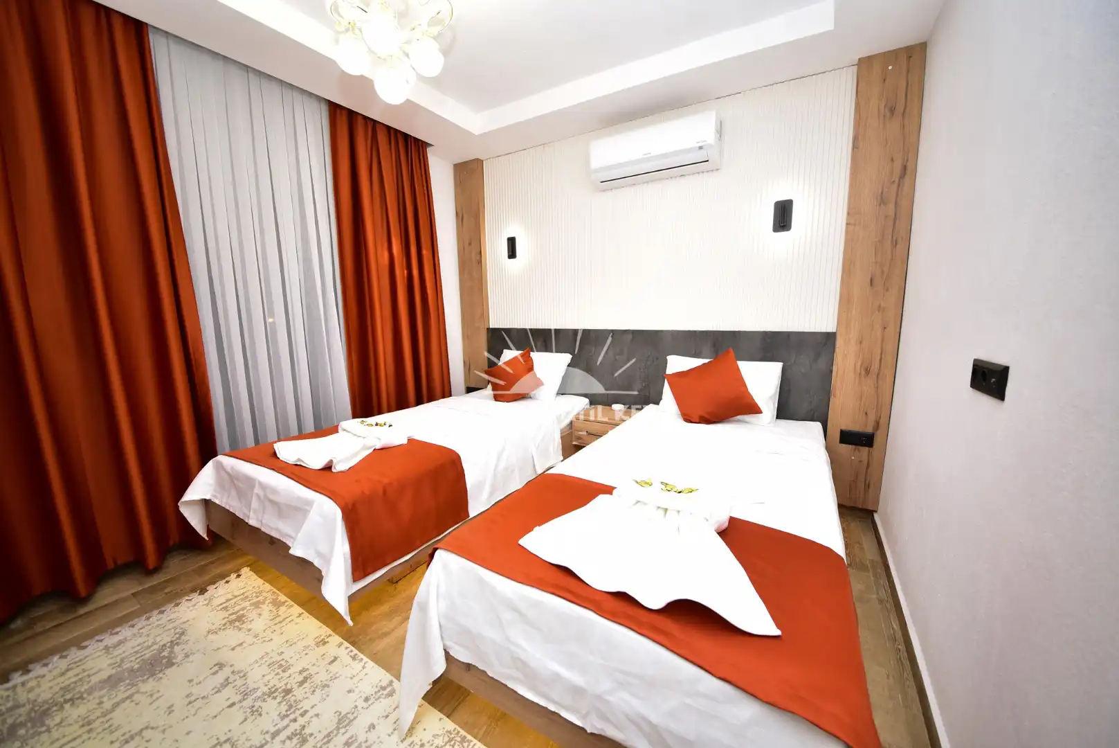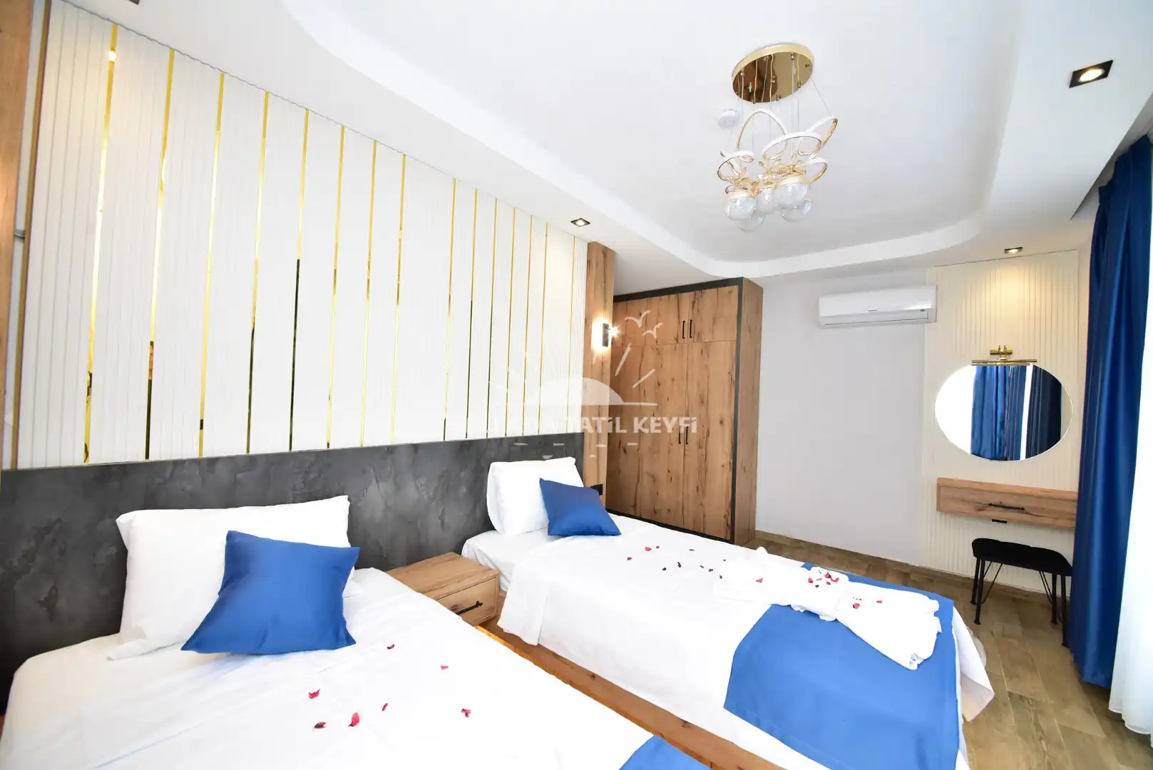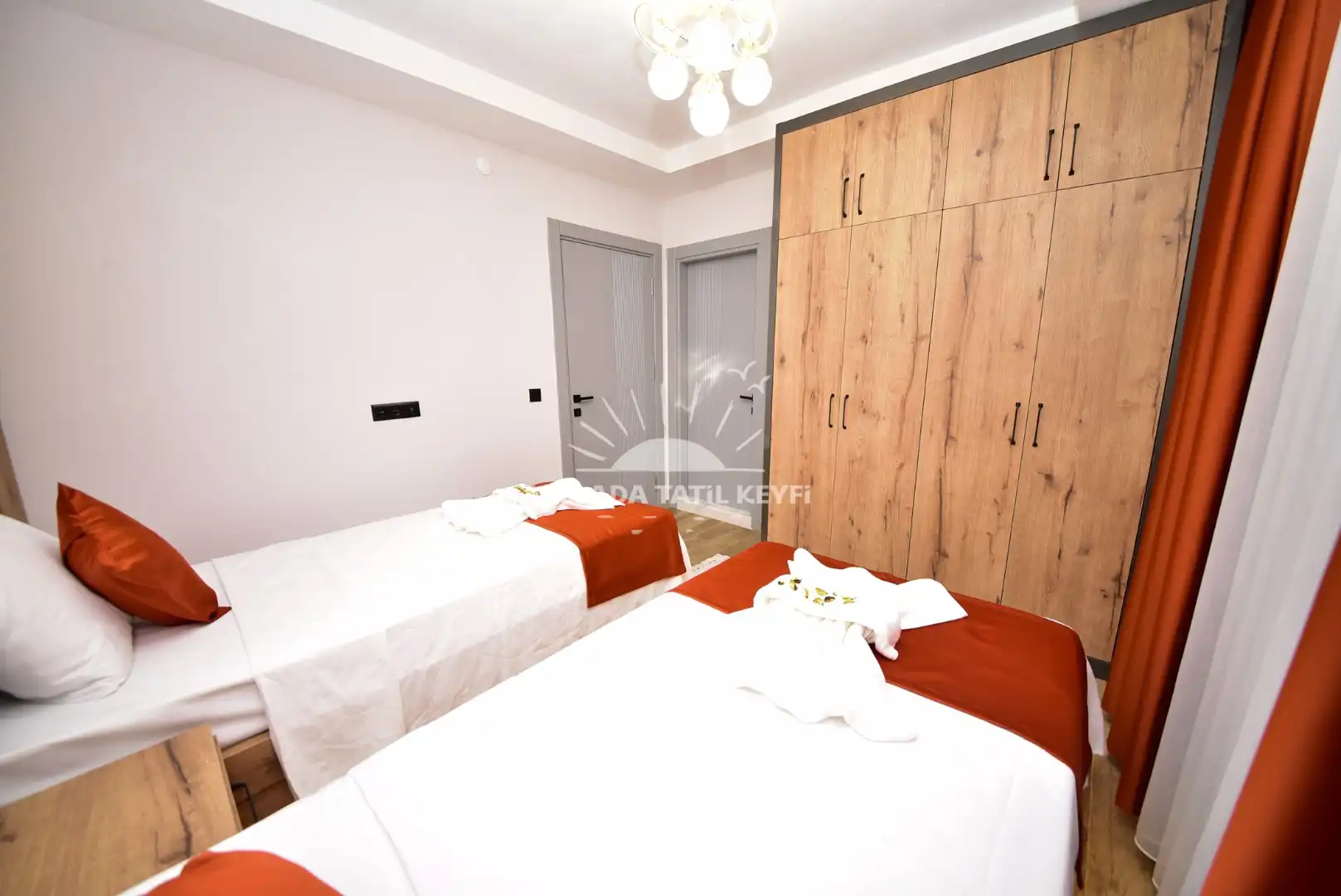 İki adet tek kişilik yatak, klima, komodin, gardırop ve banyo/WC ile konforlu bir kullanım sunar.