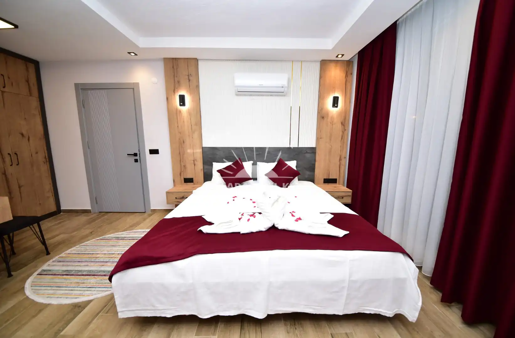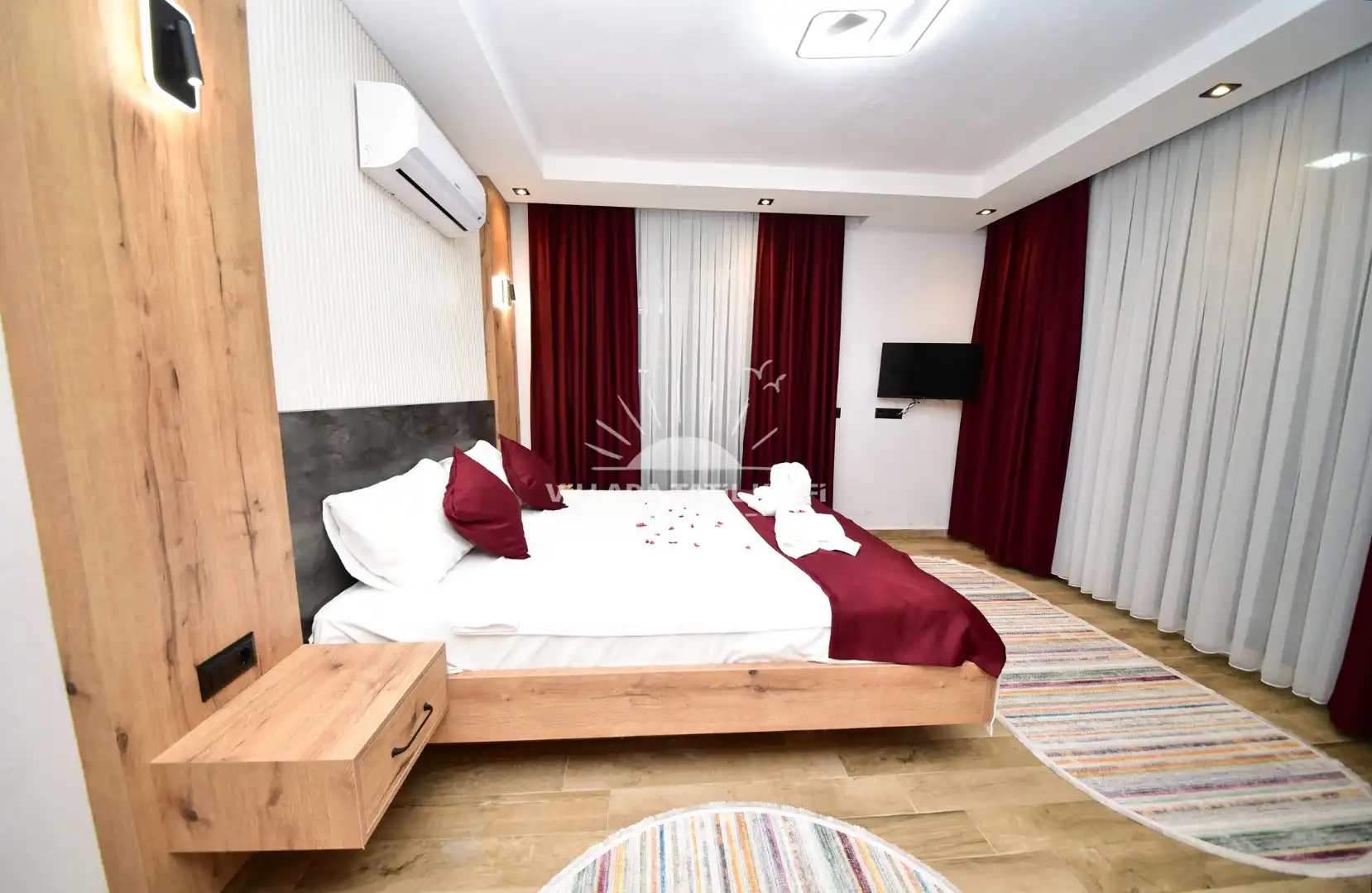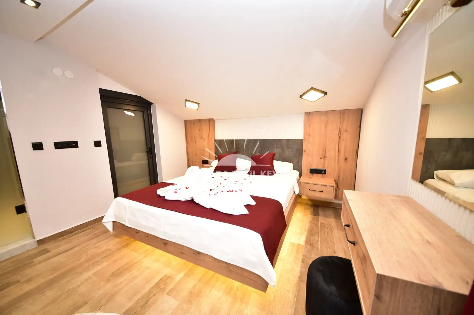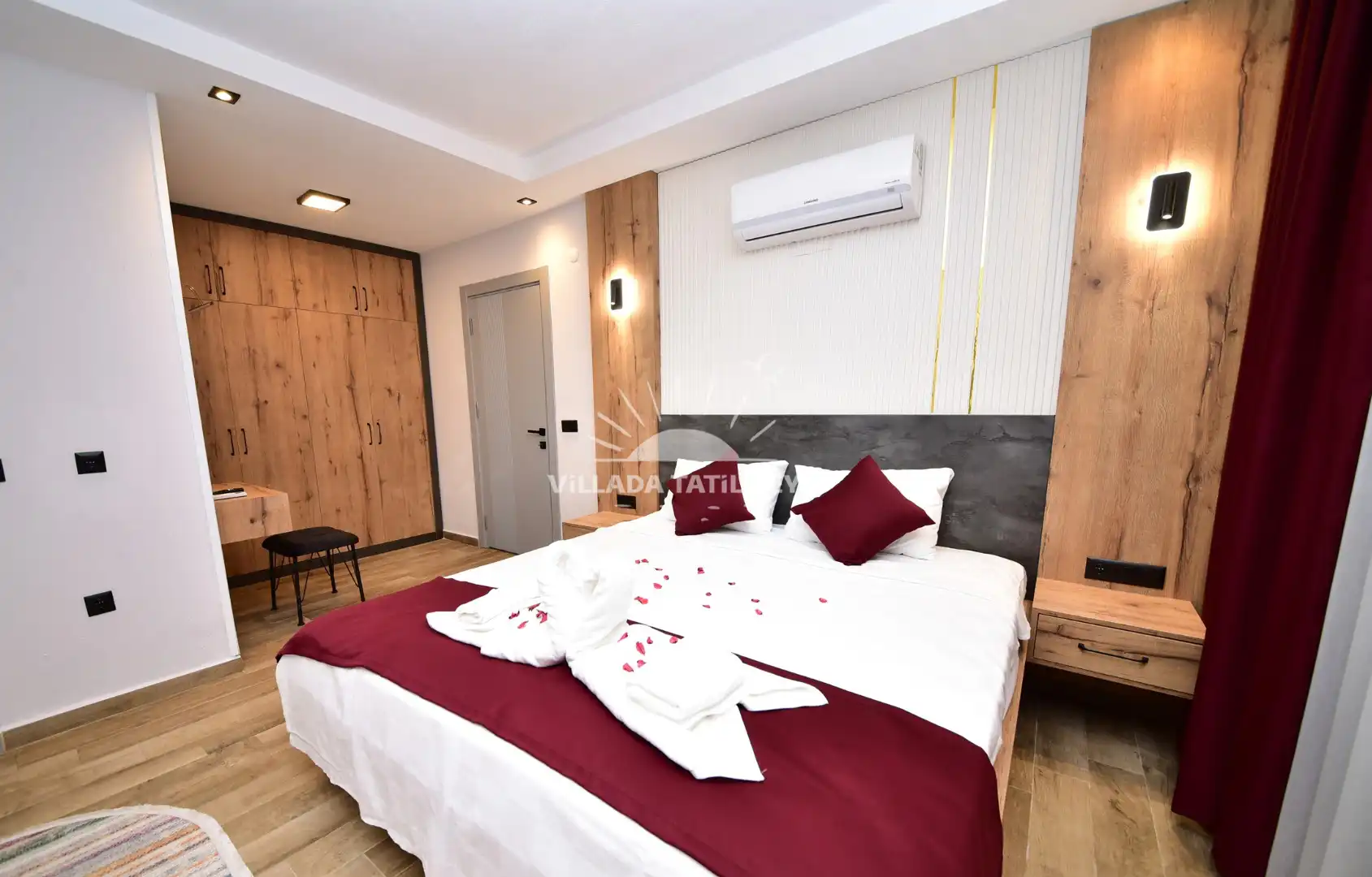 Çift kişilik yatak, klima, komodin, gardırop ve ebeveyn banyo/WC ile ferah bir konaklama alanıdır.