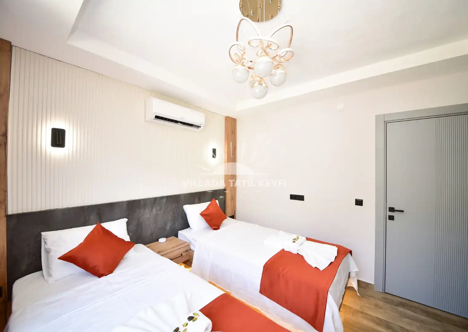 İki adet tek kişilik yatak, klima, komodin, giysi dolabı ve ortak kullanım banyo/WC.
