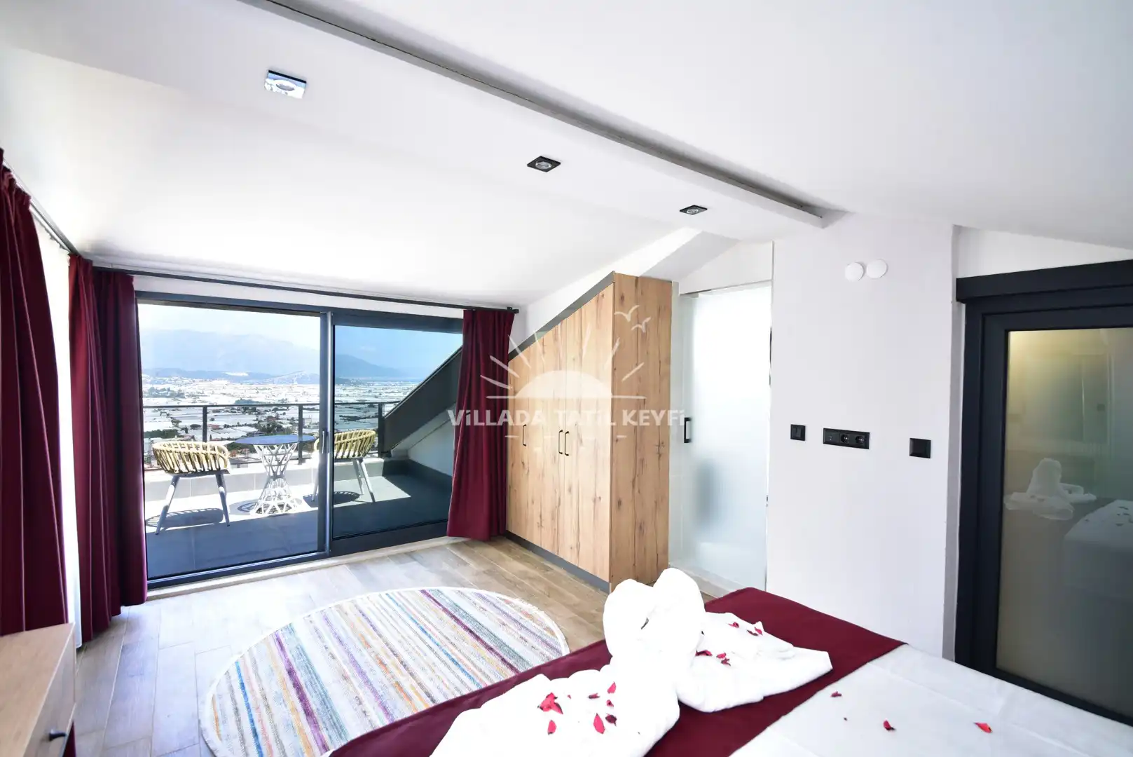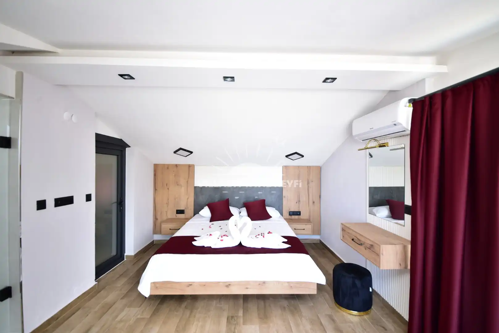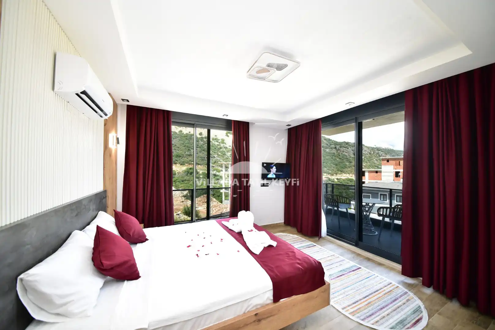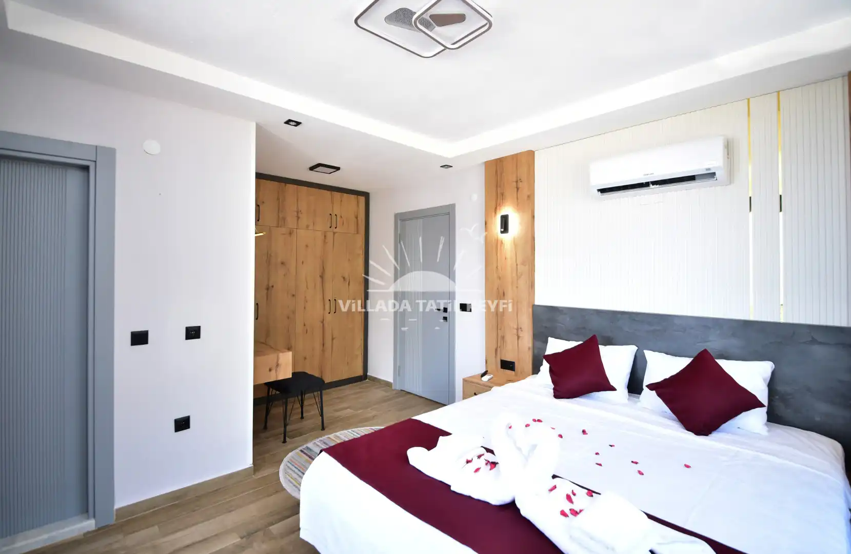 Çift kişilik yatak, klima, makyaj masası, komodin, giysi dolabı, özel balkon ve ebeveyn banyosu (WC dahil).